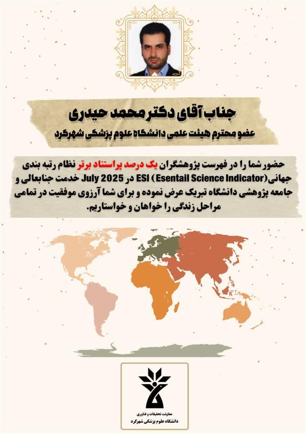 چهارمین عضو هیئت علمی دانشگاه علوم پزشکی شهرکرد در لیست پژوهشگران 1% جهان