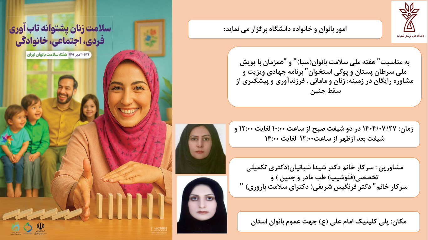 به مناسبت" هفته ملی سلامت بانوان(سبا)" و "همزمان با پویش ملی سرطان پستان و پوکی استخوان" برنامه جهادی ویزیت و مشاوره رایگان در زمینه زنان و مامائی ، فرزندآوری و پیشگیری از سقط جنین
