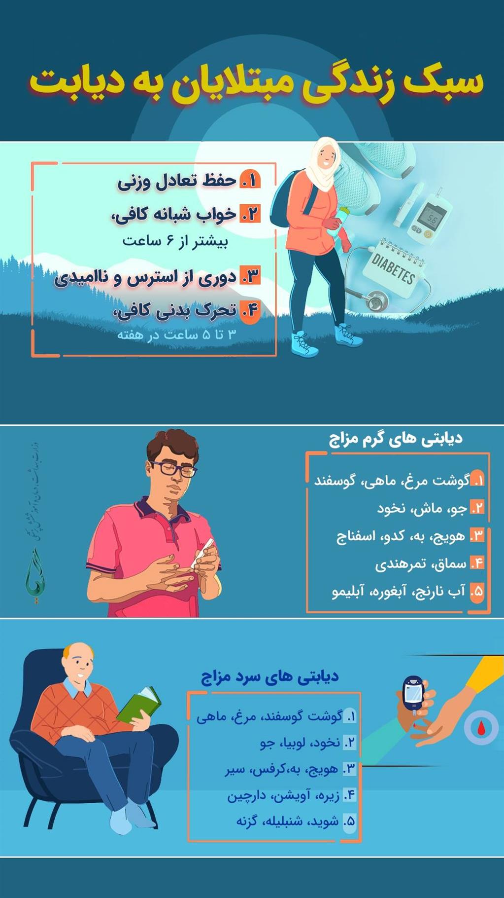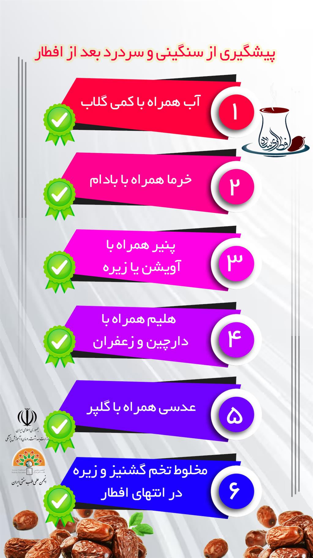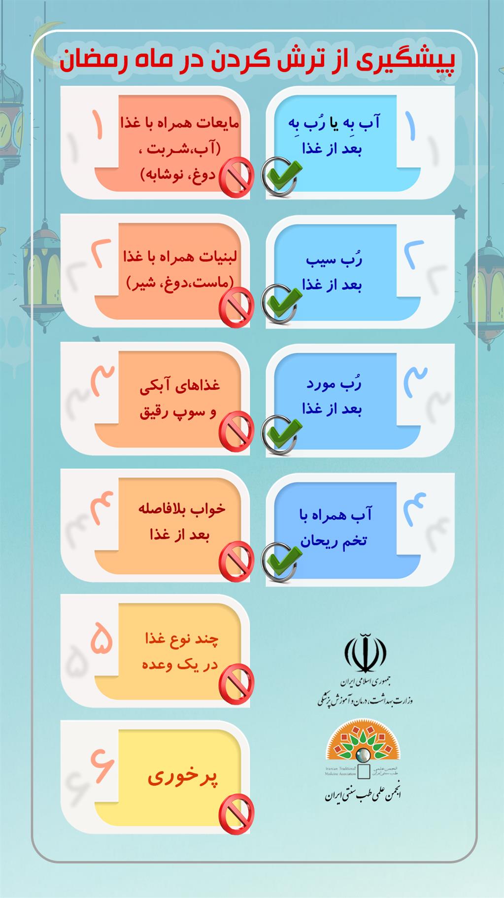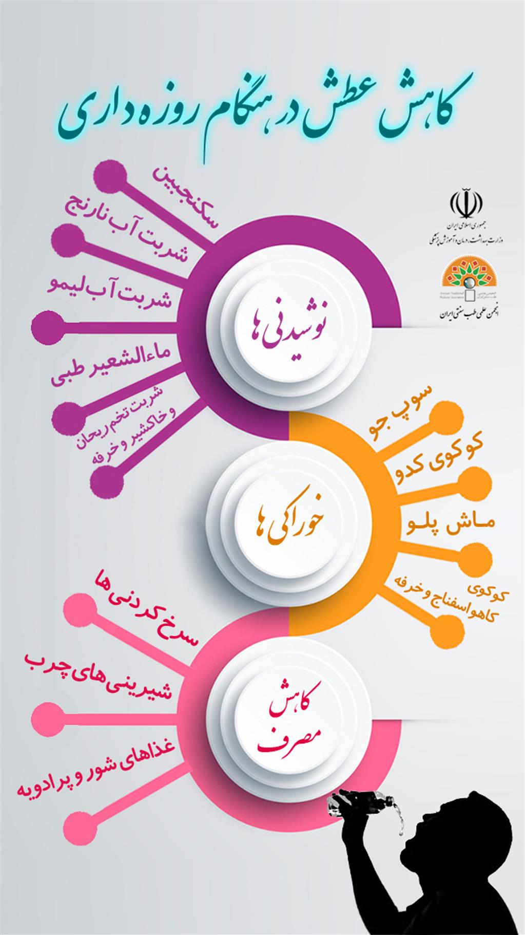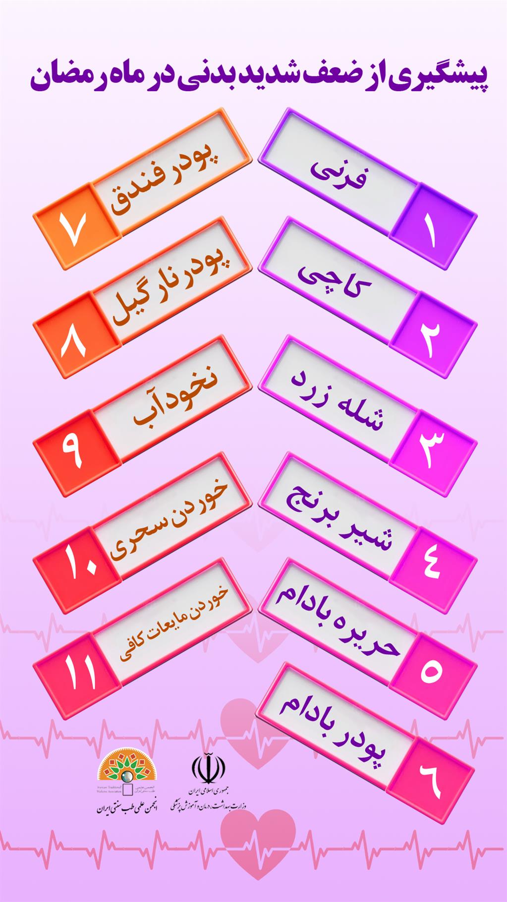 1) پیشگیری از دیابت 2) سبک زندگی مبتلایان به دیابت 3) تدابیر طب سنتی ایرانی در پیشگیری از یائسگس زودرس 4) کمک به رفع یبوست در کودکان 5) تدابیر رشد جوانان 6) چه مزاجی ؟ چه روشی ؟ 7) راه های کاهش استرس و اظطراب اینفوگرافیک های توصیه های طب ایرانی در ماه مبارک رمضان : |