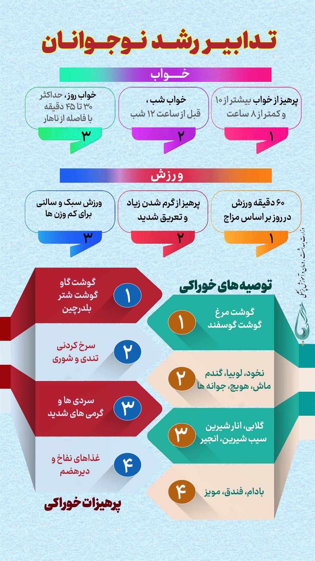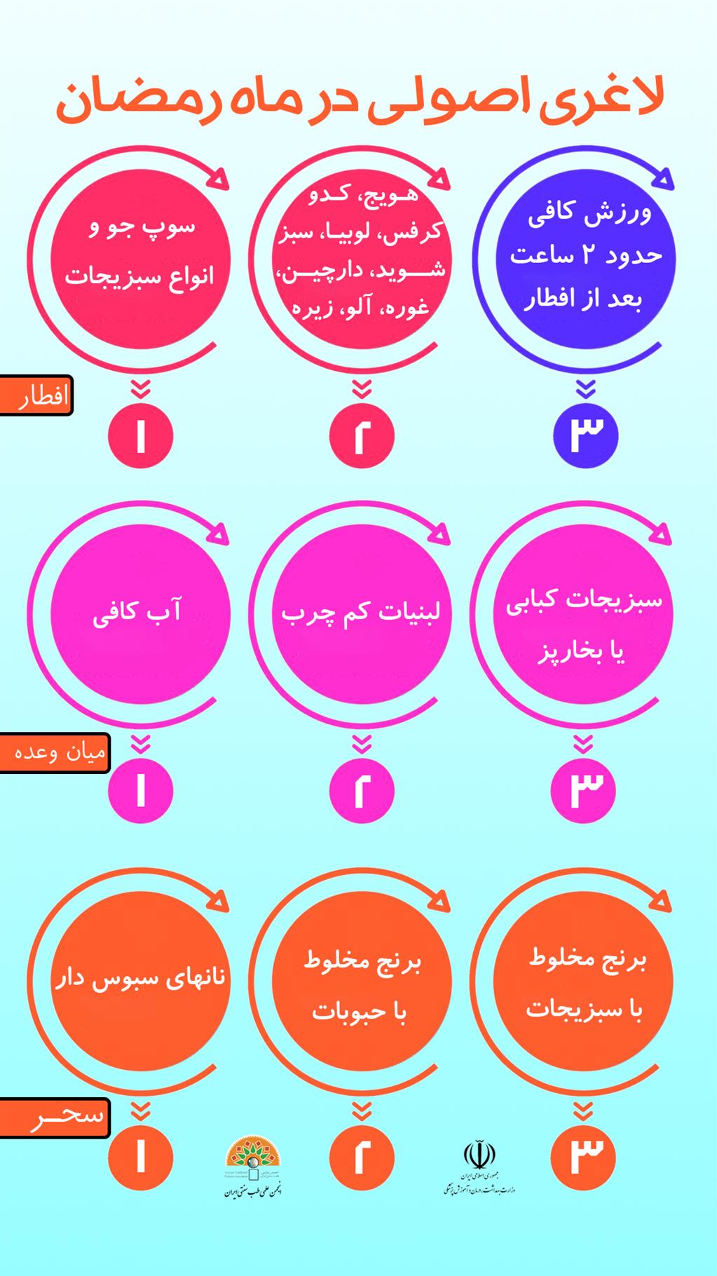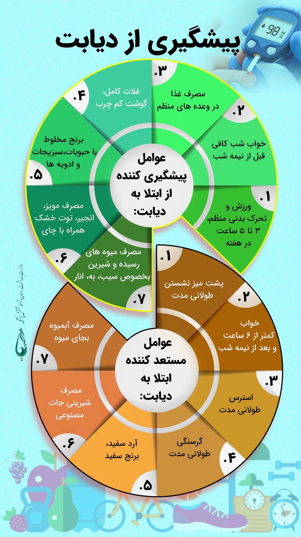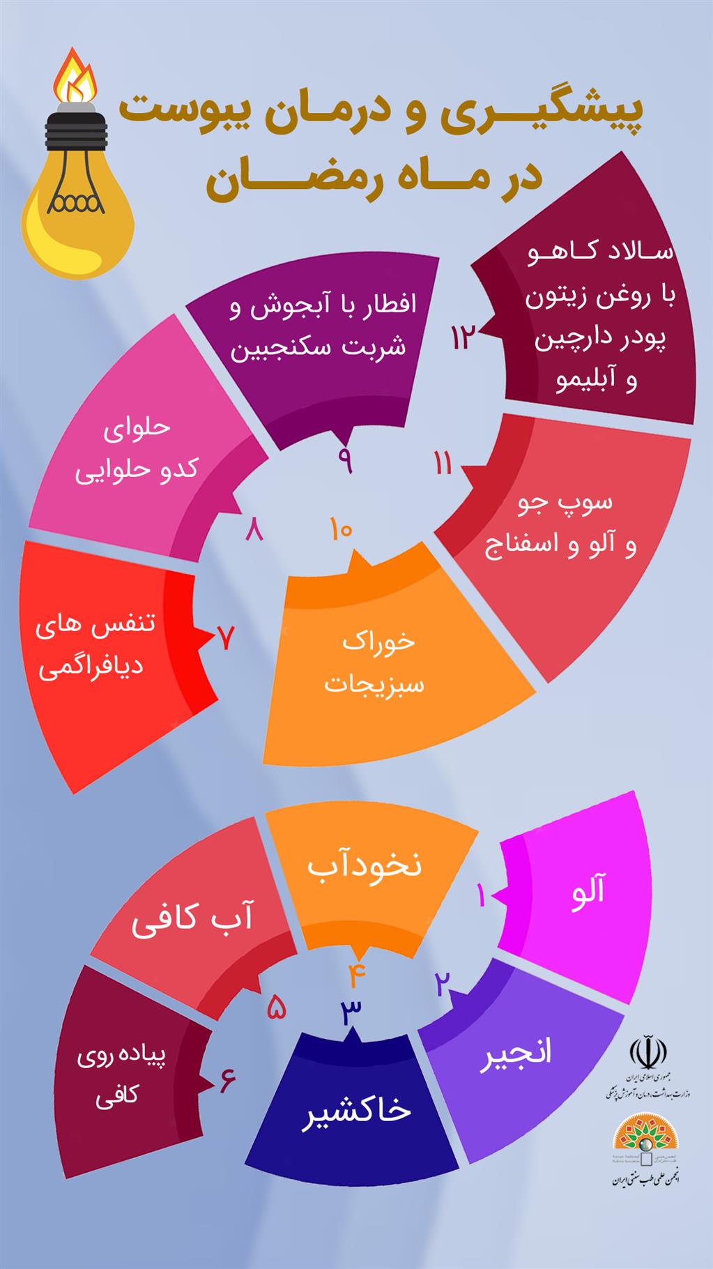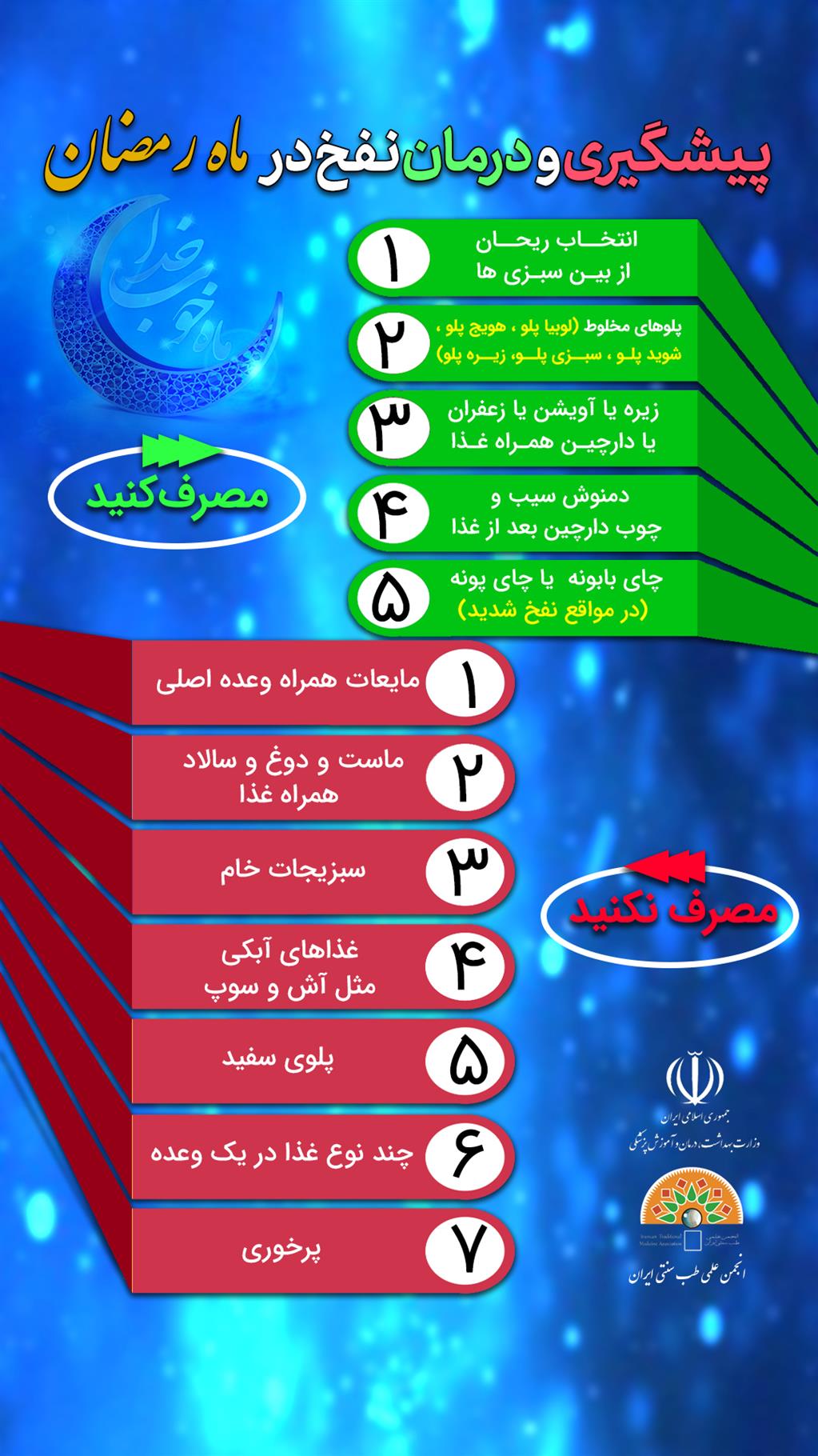 1) پیشگیری از دیابت 2) سبک زندگی مبتلایان به دیابت 3) تدابیر طب سنتی ایرانی در پیشگیری از یائسگس زودرس 4) کمک به رفع یبوست در کودکان 5) تدابیر رشد جوانان 6) چه مزاجی ؟ چه روشی ؟ 7) راه های کاهش استرس و اظطراب اینفوگرافیک های توصیه های طب ایرانی در ماه مبارک رمضان : |