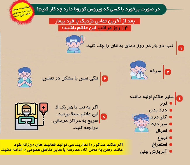 بعد از آخرين تماس نزديك با فرد بيمار 14 روز مراقب اين علائم باشيد: