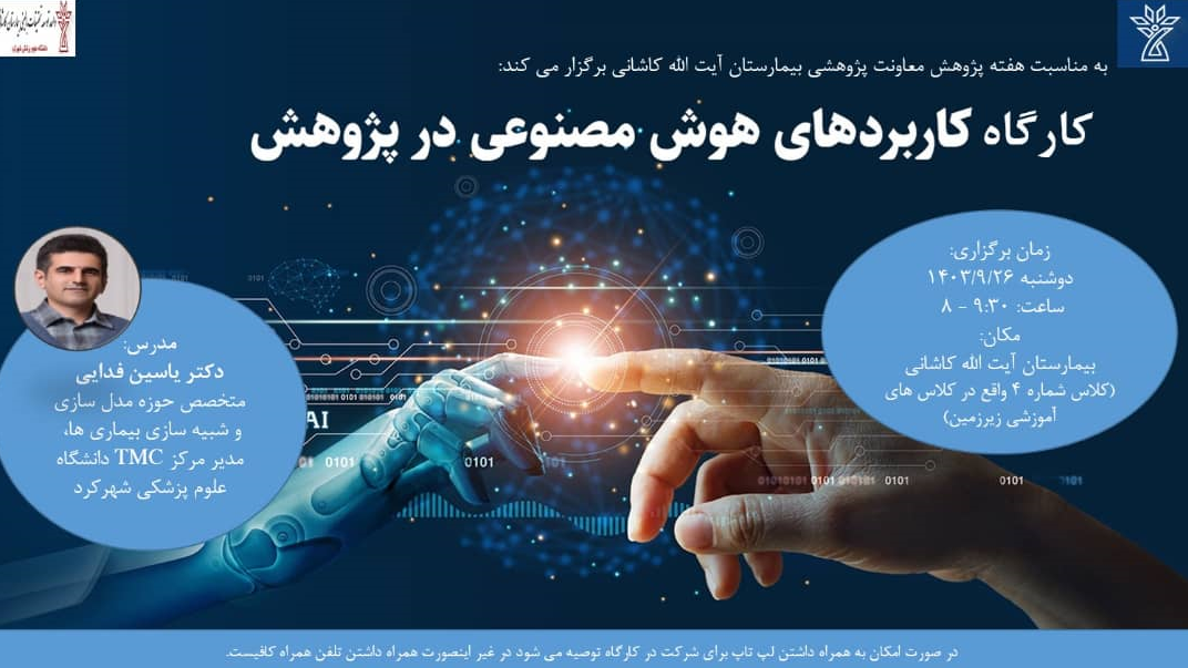 واحد توسعه تحقیقات بالینی مرکز آموزشی درمانی آیت الله کاشانی شهرکرد همزمان با هفته پژوهش و فناوری در راستای تقویت روحیه پژوهش و فناوری در سطح بیمارستان و ارج نهادن به مقام پژوهش و فناوری کارگاهی با عنوان " کاربرد هوش مصنوعی در پژوهش " ویژه اعضای هیئت علمی و دانشجویان در تاریخ 1403/9/26 با تدریس جناب آقای دکتر یاسین فدایی برگزار نمود.